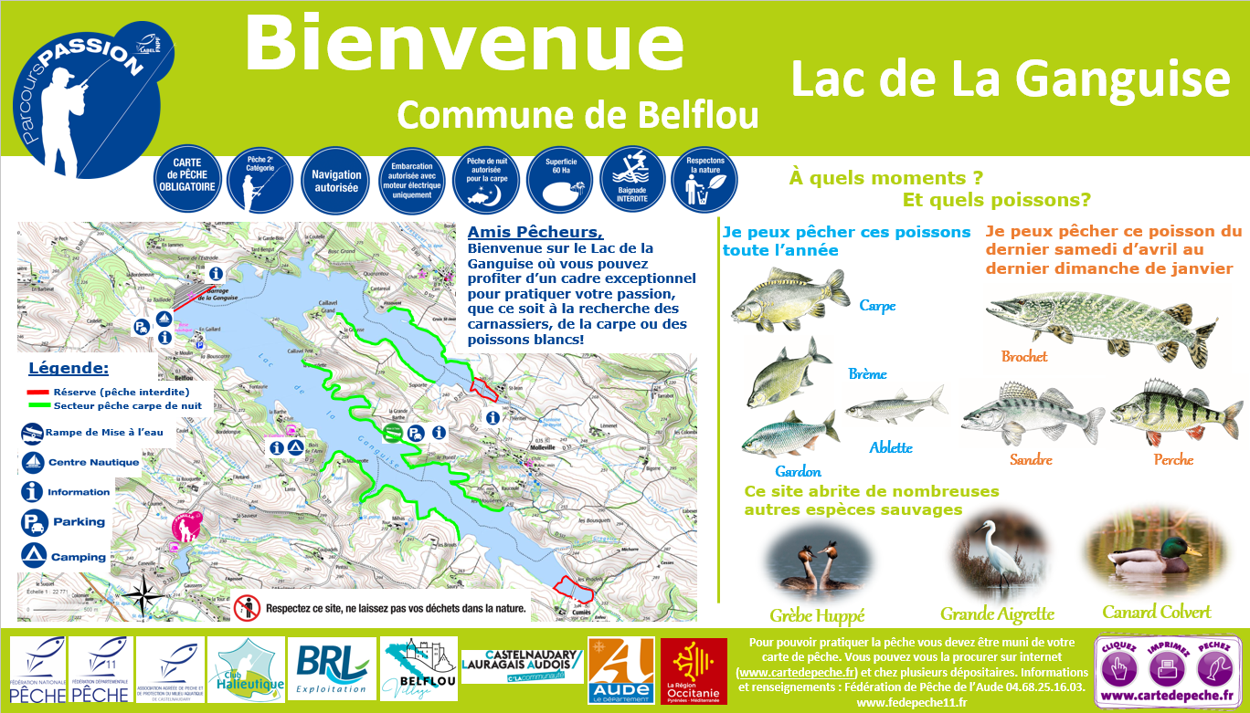 Le Lac de la Ganguise, en Pays Lauragais Audois, est le plus grand lac du département avec une superficie de 373 ha. Il a la particularité de présenter un cadre atypique avec des forêts en partie immergées ; ce qui est assez rare en France et qui offre une pêche de qualité. Labellisé au niveau national en Parcours Passion celui-ci se prête bien à trois techniques de pêche que sont :